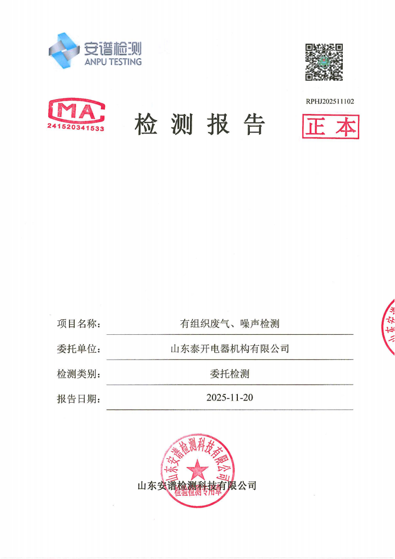 山东泰开电器机构有限公司废气、噪声检测